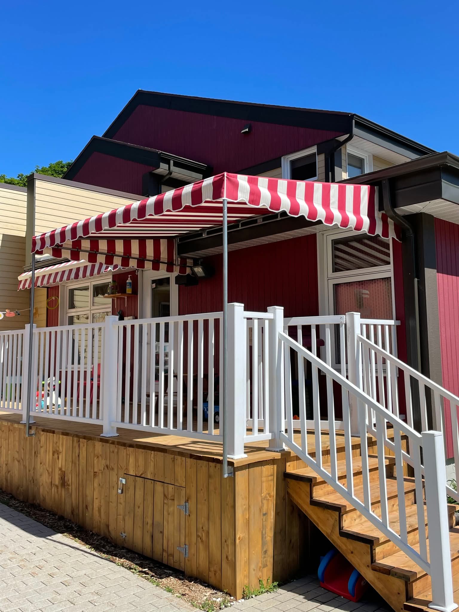 Apportez de l’ombre, de la protection contre le vent, la pluie ou la neige avec un auvent fixe pour votre terrasse. Fabrication sur mesure afin de bien adapter l’auvent à votre espace et de s’assurer de la solidité des ancrages.